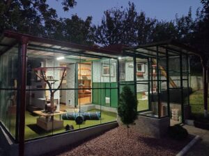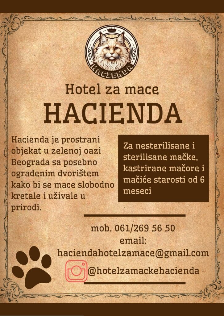 Dobrodošli u Haciendu, hotel za mačke u zelenoj oazi mira gde su udobnost, sigurnost i osećaj doma uvek na prvom mestu. Objekat se sastoji od zatvorenog i otvorenog dvorišnog dela posebno ograđenog kako bi mace bile sigurne. Mačke se po objektu kreću slobodno uz dovoljno mesta za igru, trčanje, skakanje i spavanje. Istovremeno imaju stalni kontakt sa prirodom po čemu smo i jedinstveni.