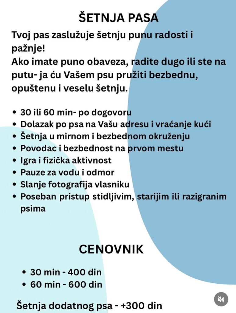 Šetnja do 1h- 600 din, čuvanje u njihovom domu do 1h - 600 din.