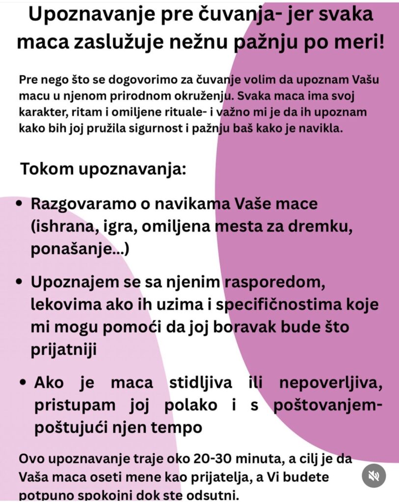 Hranjenje, voda, čišćenje posipa, igra i maženje 😻 Obilazak 1x dnevno - 500 din, 2x dnevno -900 din (od 30 min do 1h).